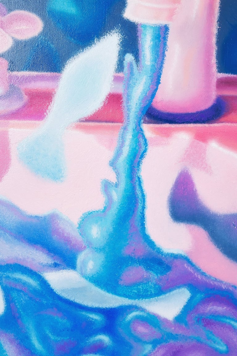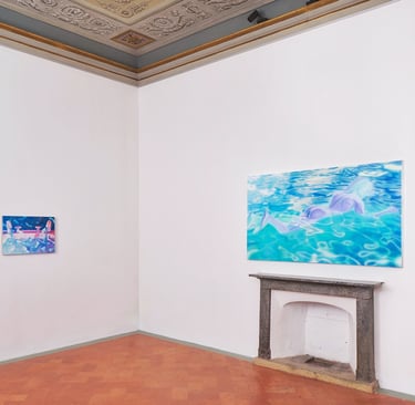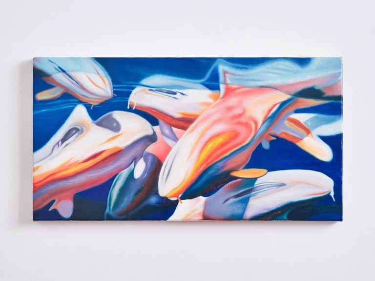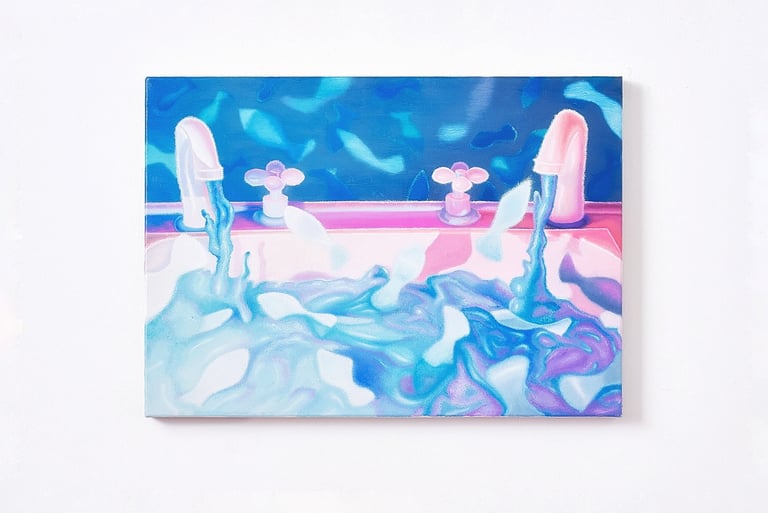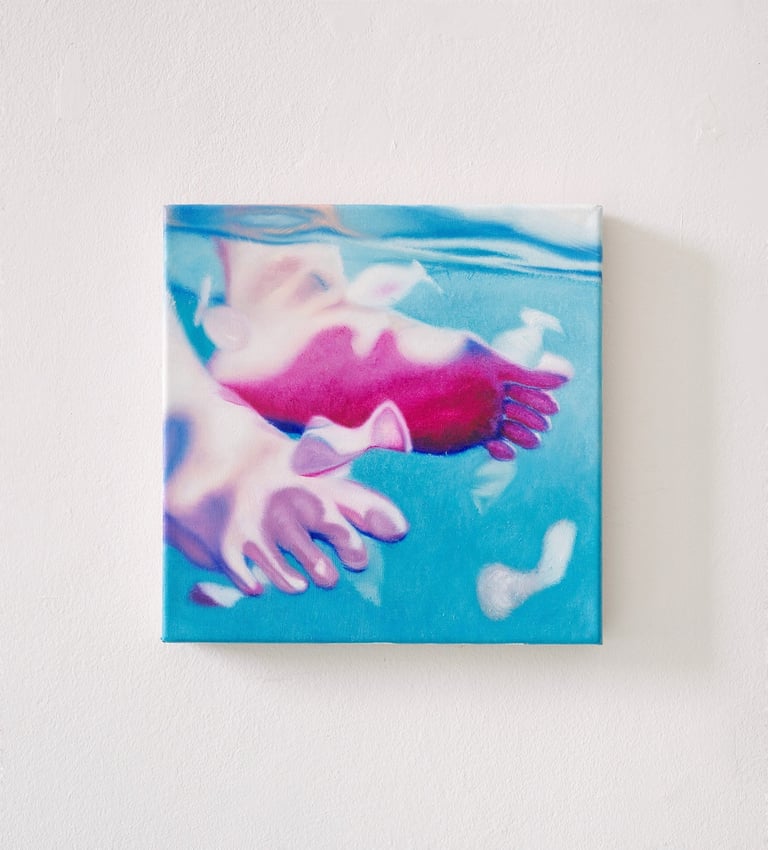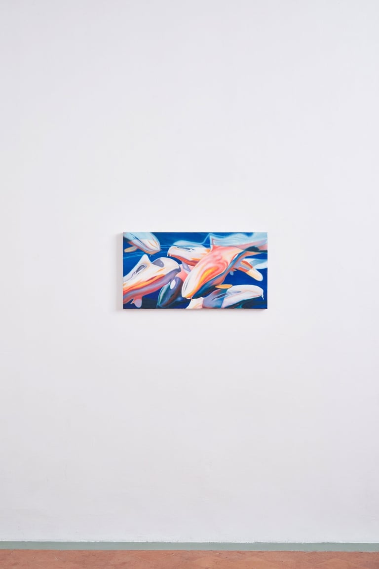 From summer 2021 through summer 2023, sharp, polished edges dominated Sam’s paintings, a detailed and precise replication of his own digital references. Then, a change. Quick brush marks and strokes, glazing and stumbling, alternating techniques that move beyond the reference. Stippling and pointillism, form fuzzy images of subjects and objects, as if memory has been taking over, enveloping details and blending them within an alternative reality. People, which used to be present in every painting, has given room to objects and creatures. A personal, serendipitous, naive moment - suncream on an iPhone camera, in Liguria, this past summer - Sam discovered foggy images of water reflections that instilled inspiration in the artist. Inspiration comes to us in the most unexpected, simple ways.