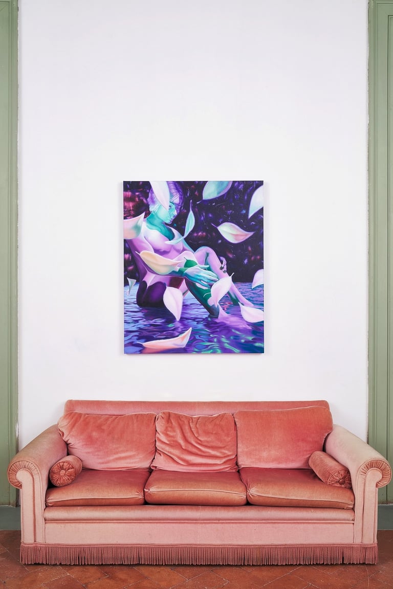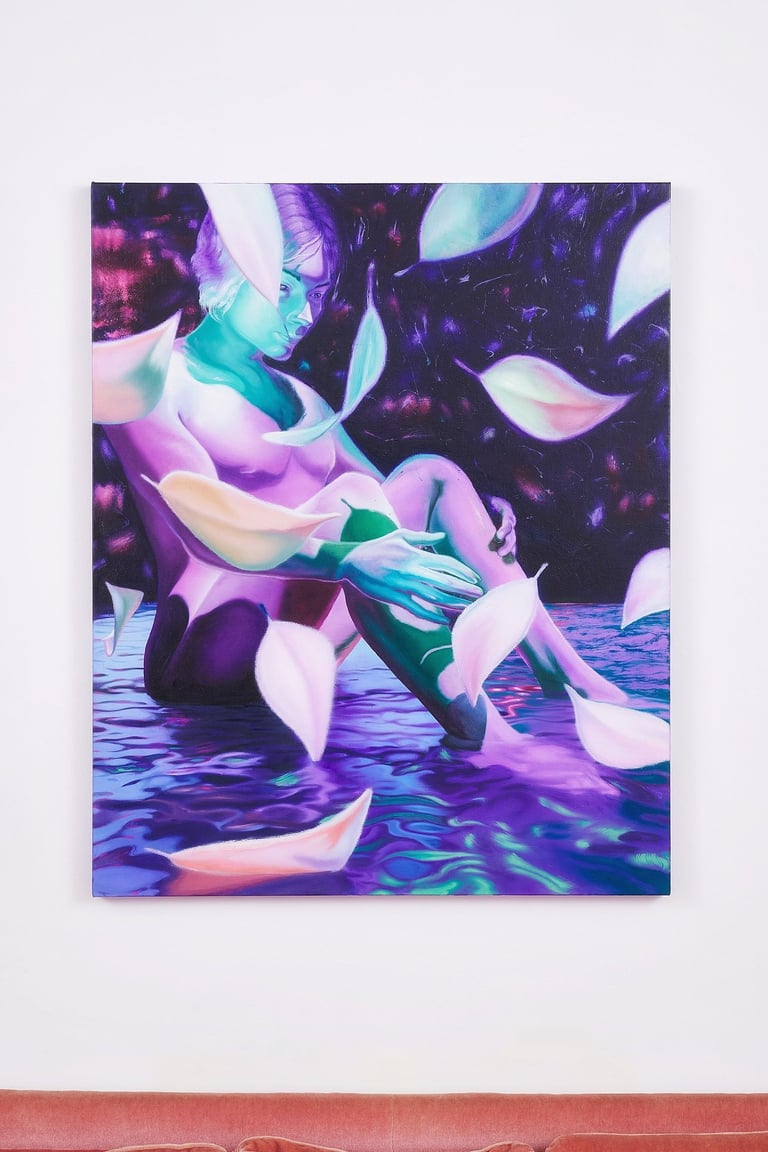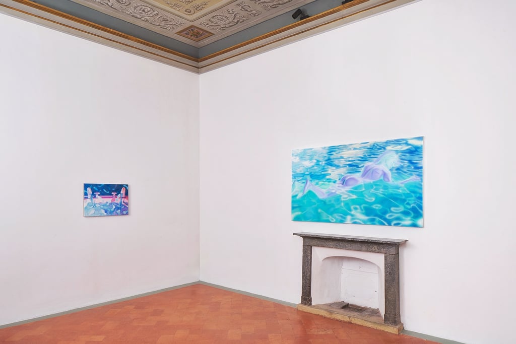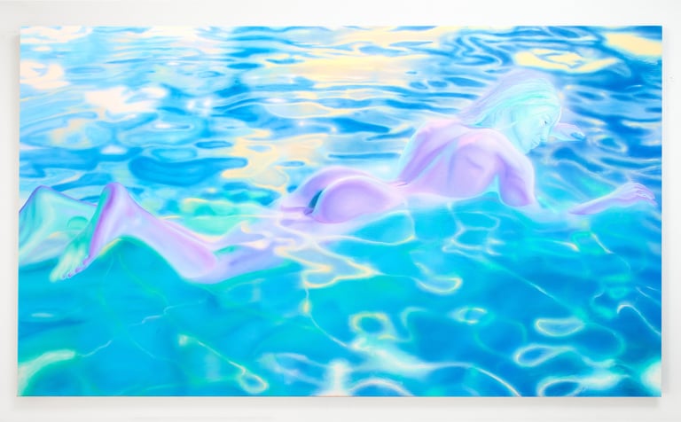 From summer 2021 through summer 2023, sharp, polished edges dominated Sam’s paintings, a detailed and precise replication of his own digital references. Then, a change. Quick brush marks and strokes, glazing and stumbling, alternating techniques that move beyond the reference. Stippling and pointillism, form fuzzy images of subjects and objects, as if memory has been taking over, enveloping details and blending them within an alternative reality. People, which used to be present in every painting, has given room to objects and creatures. A personal, serendipitous, naive moment - suncream on an iPhone camera, in Liguria, this past summer - Sam discovered foggy images of water reflections that instilled inspiration in the artist. Inspiration comes to us in the most unexpected, simple ways.