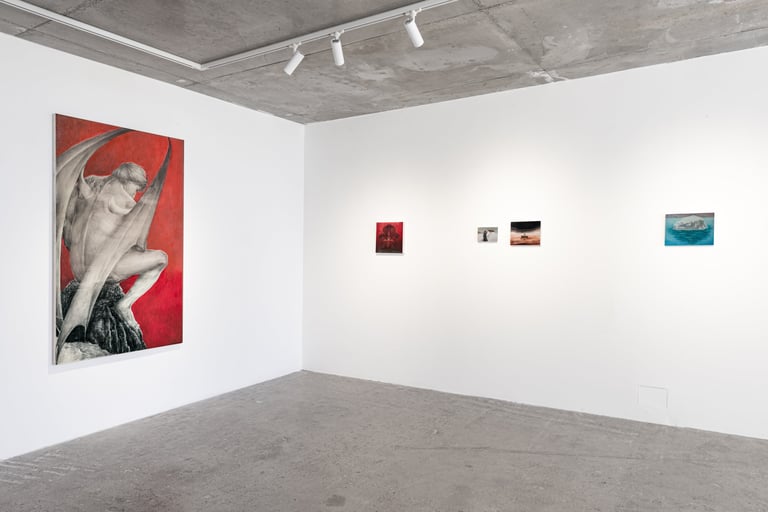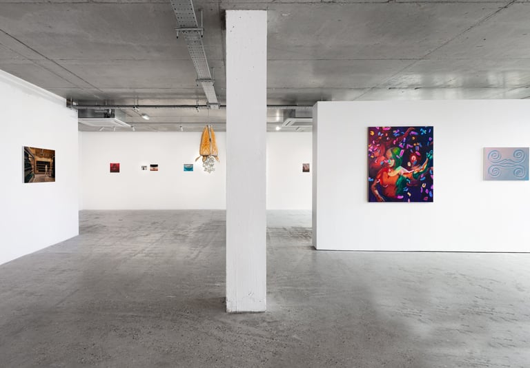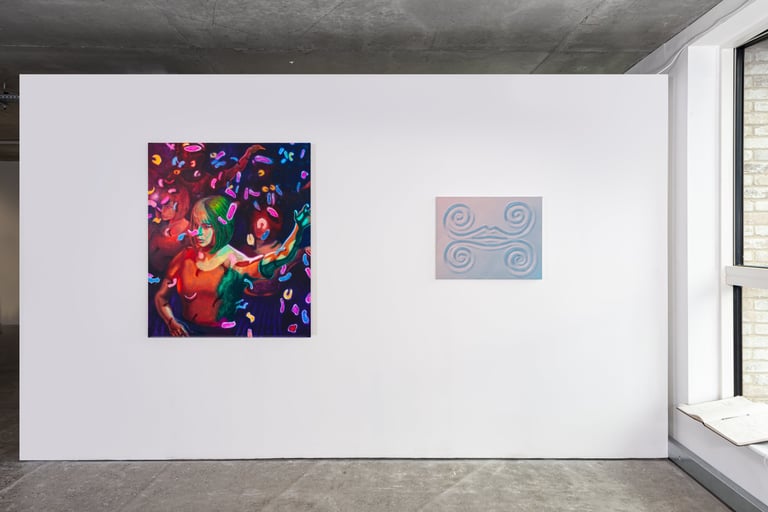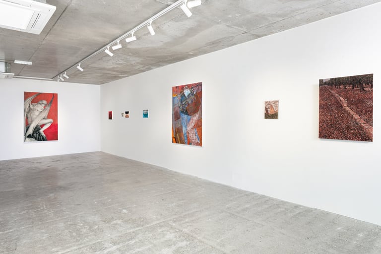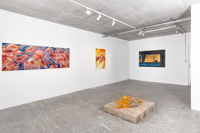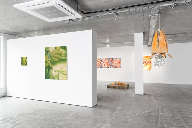 In Burling’s whimsical paintings, sharp dystopian objects infiltrate idyllic quotidian sceneries, addressing the climate and existential anxiety looming over our generation. The apocalyptic light, leaving us uncertain whether it is representing dawn or dusk, sets the viewer within a liminal atemporal space of transformation; in the artist’s words, “It could be either a shepherd’s warning or a delightful spectacle”. While Cameron’s cinematic paintings, executed with a loose wet brushstroke, depict the alienation of contemporary cities, oscillating between interior and exterior settings and the sensations of being walled off or overly exposed.